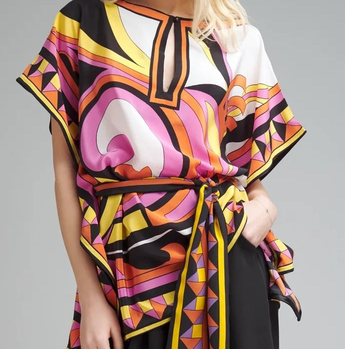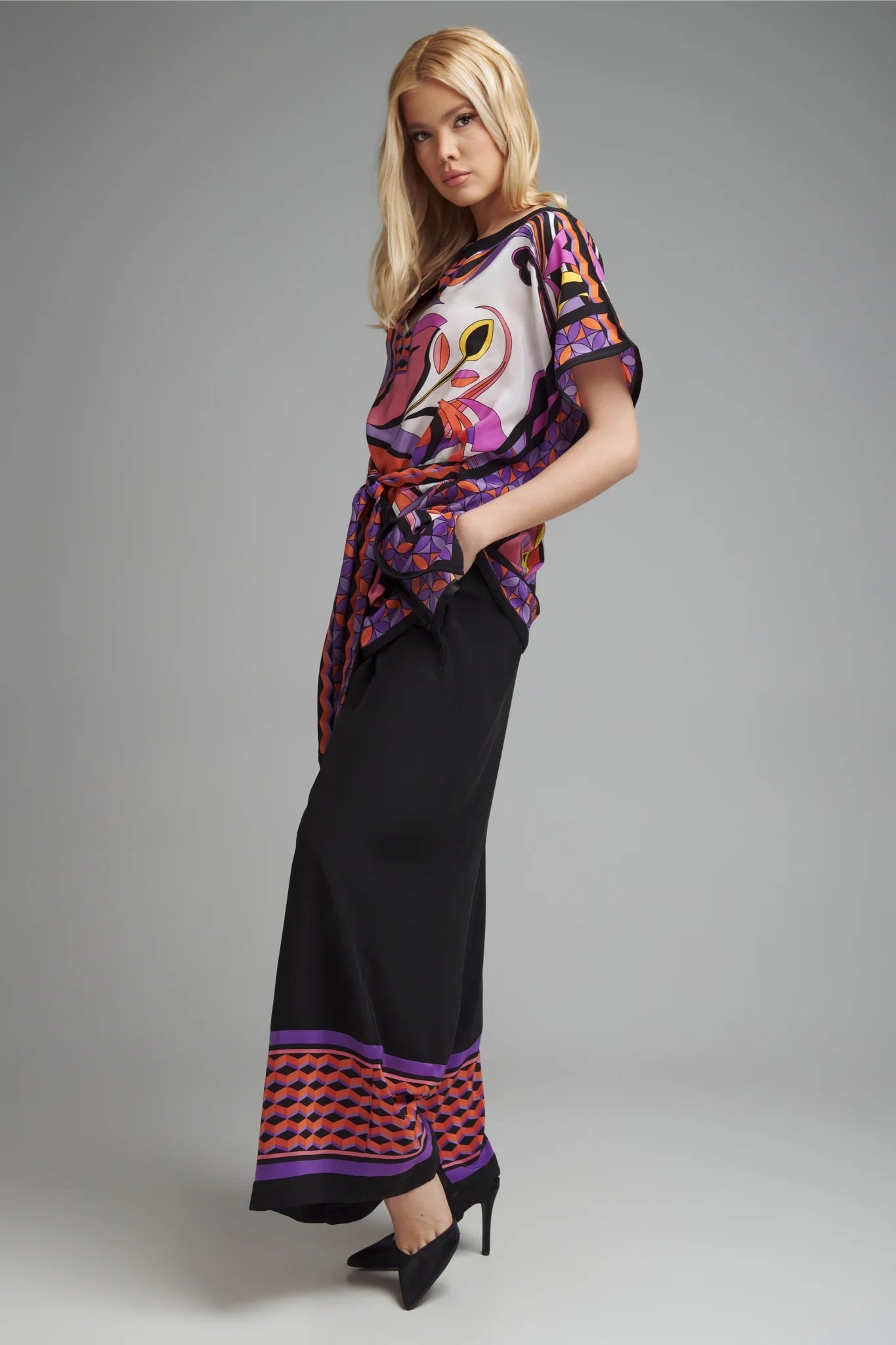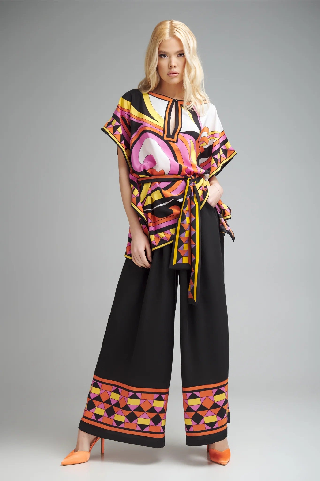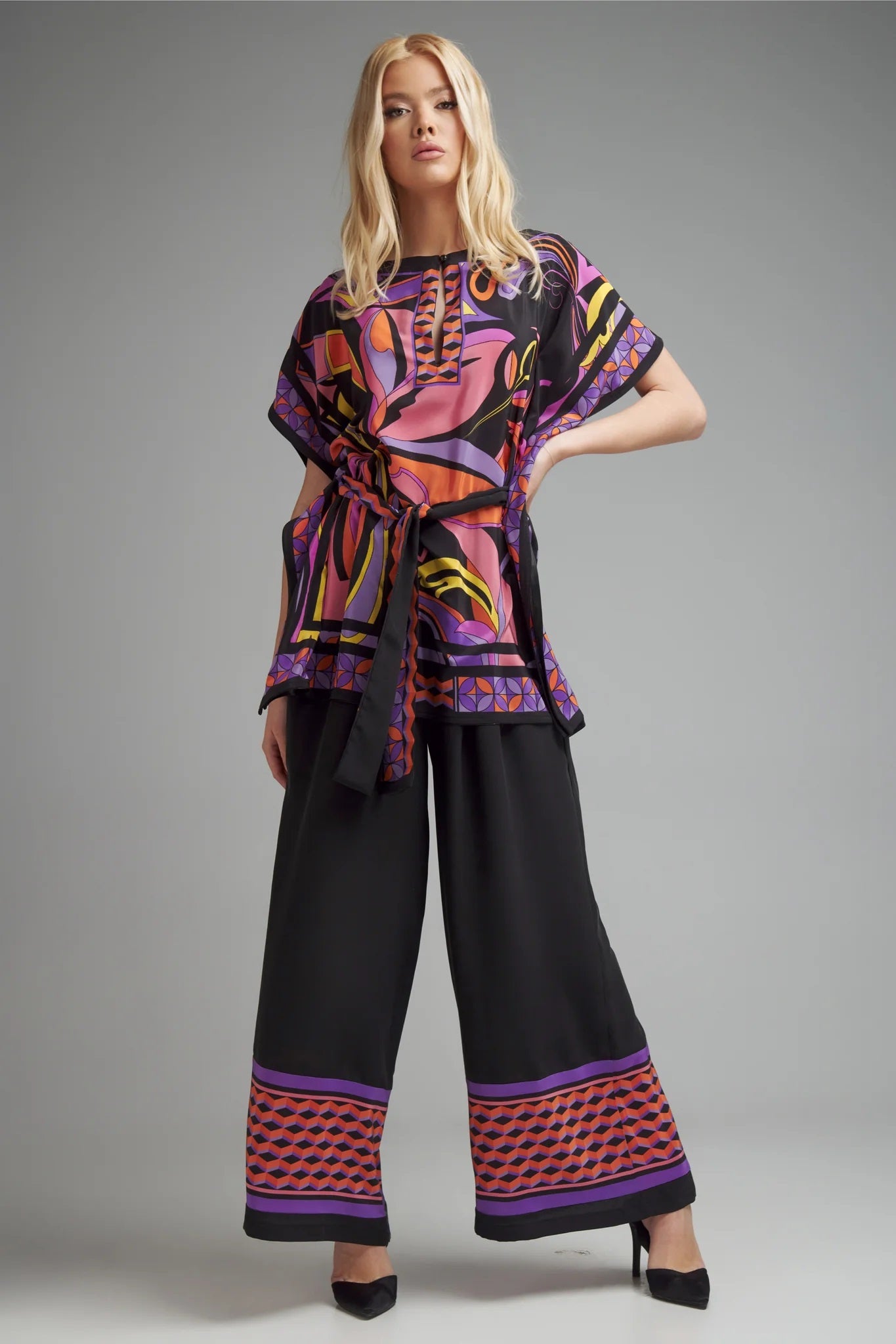 With a retro-inspired vibe, this kaftan set blends abstract swirls and geometric prints in orange, mustard, and purple. The flowing silhouette cinches at the waist with a matching tie belt, while the palazzos stand out with a bold mosaic-style printed hemline.