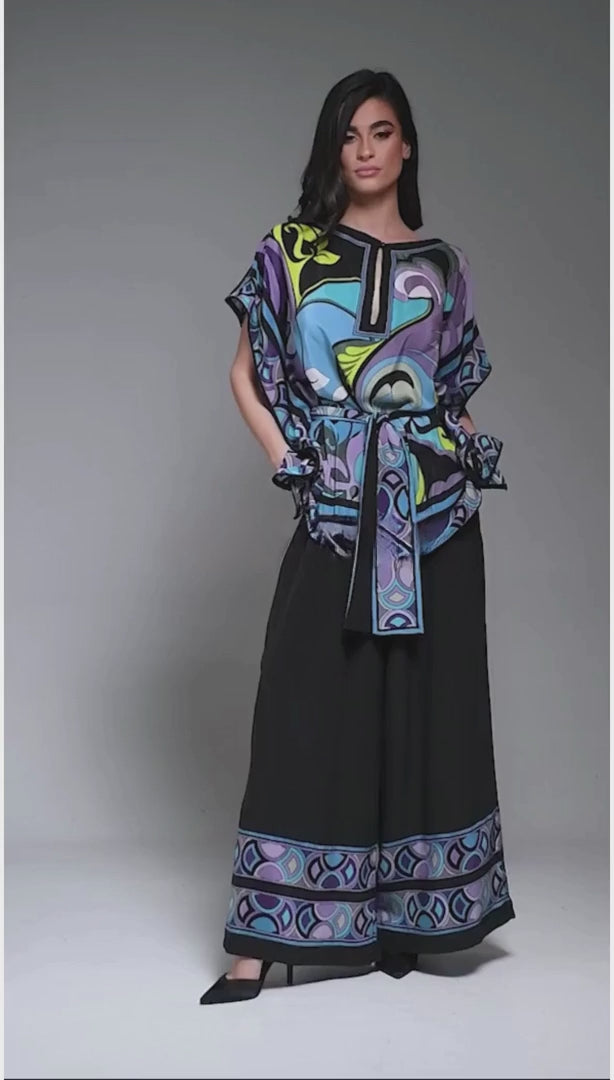 A refreshing kaftan-style co-ord set in aqua blue, teal, lavender, and black abstract swirls. The breezy silhouette is cinched with a matching belt and paired with wide black palazzos adorned with blue & lilac circular patterned hems. The cool tones make this set ideal for summer evenings and resort getaways.