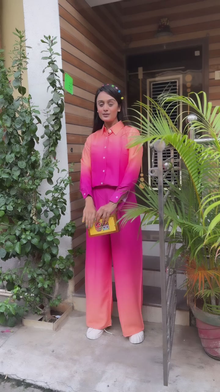 A vibrant ombre co-ord set blending neon lime and aqua blue shades, designed in smooth Russian satin for a luxe and fresh look.