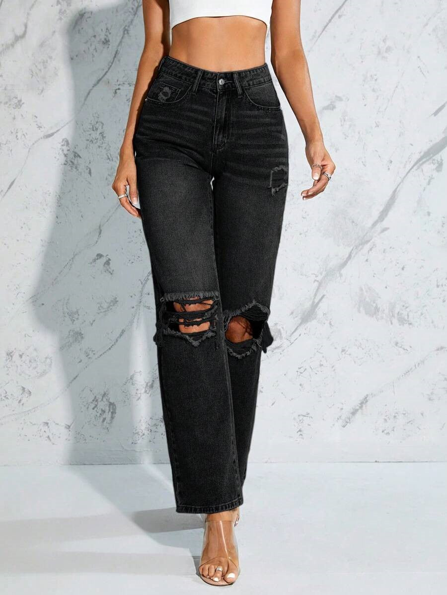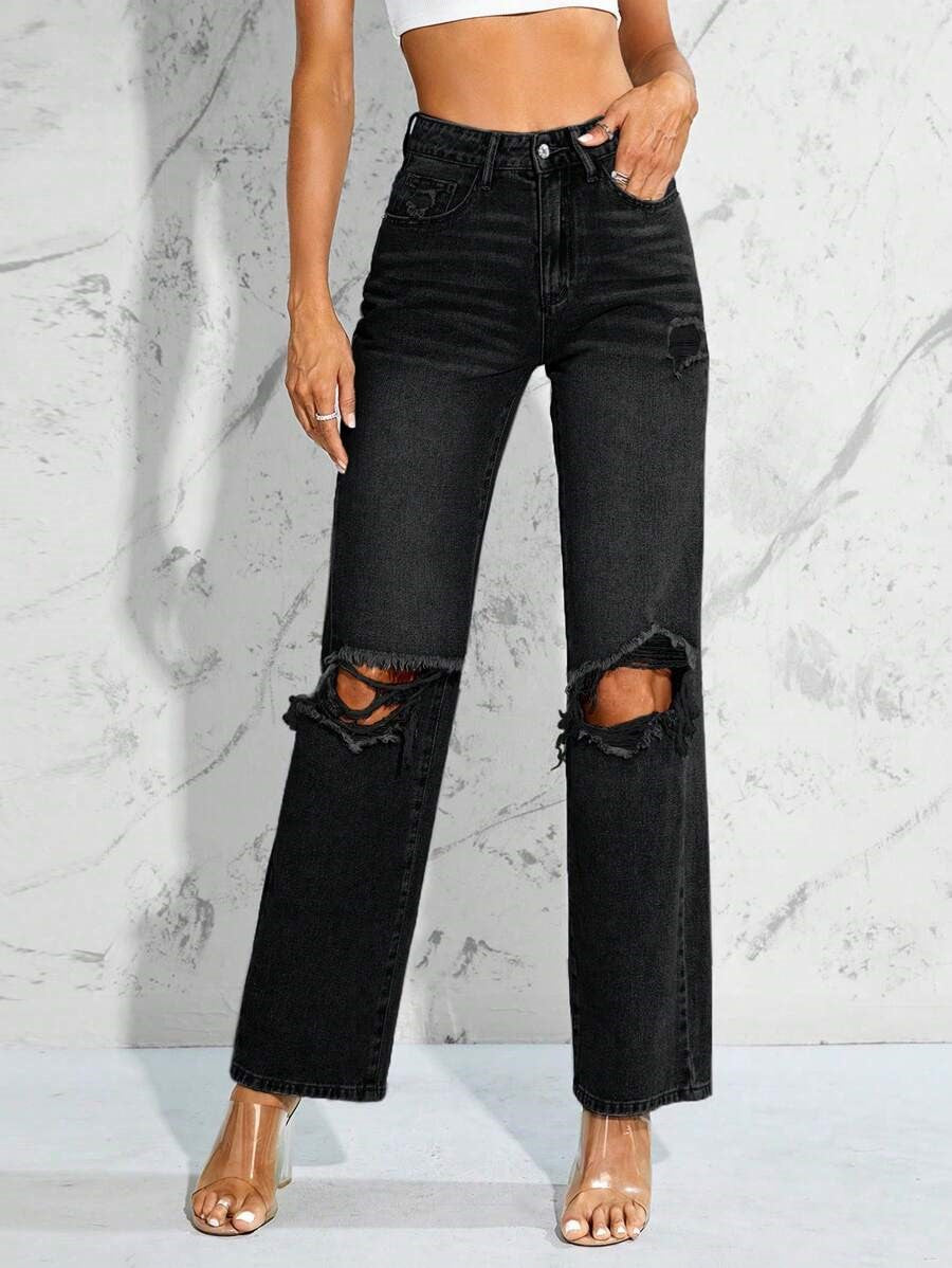 These are high-rise jeans with a relaxed straight leg and all-over vintage fade. They’re crafted from heavyweight cotton denim that holds its shape while softening with every wear. The standout detail? Strategic knee distressing and raw-edge tears designed to give a worn-in, effortlessly edgy finish. This version comes in a washed black with classic five-pocket styling and a structured waistband that hugs in all the right places.