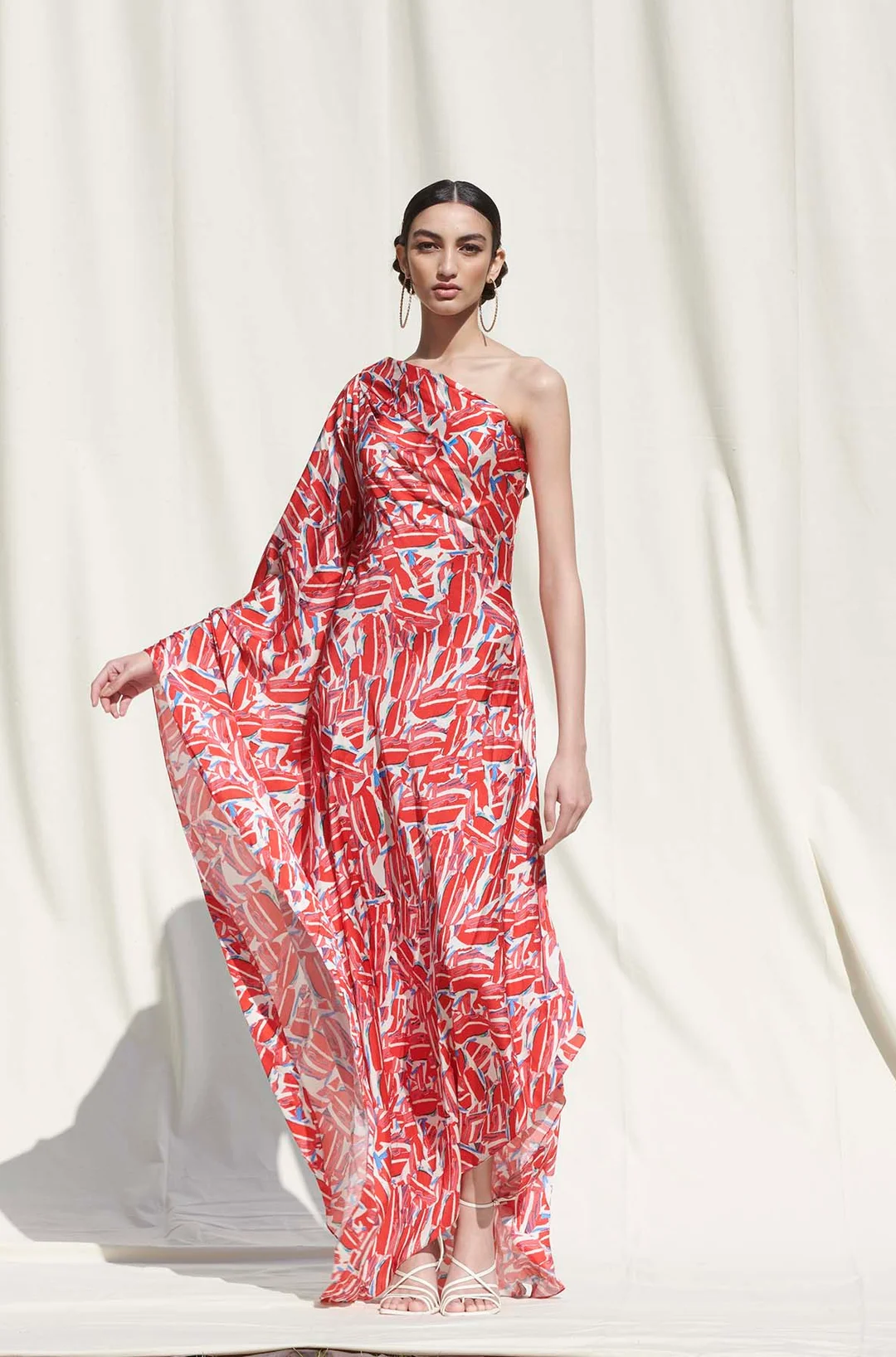 Vibrant and bold, this one-shoulder printed gown is a celebration of contemporary fashion. The asymmetric cut and striking red abstract print make it a standout choice for festive occasions or art-inspired events.