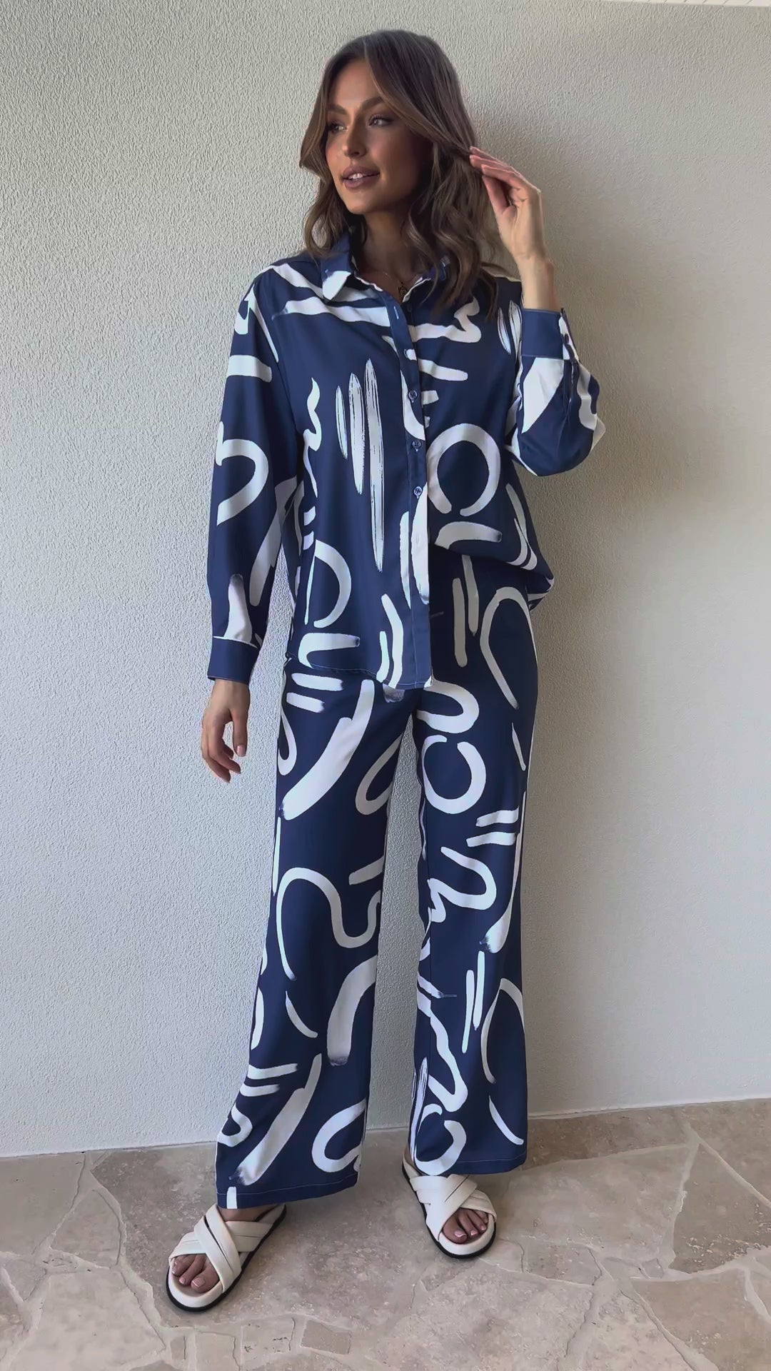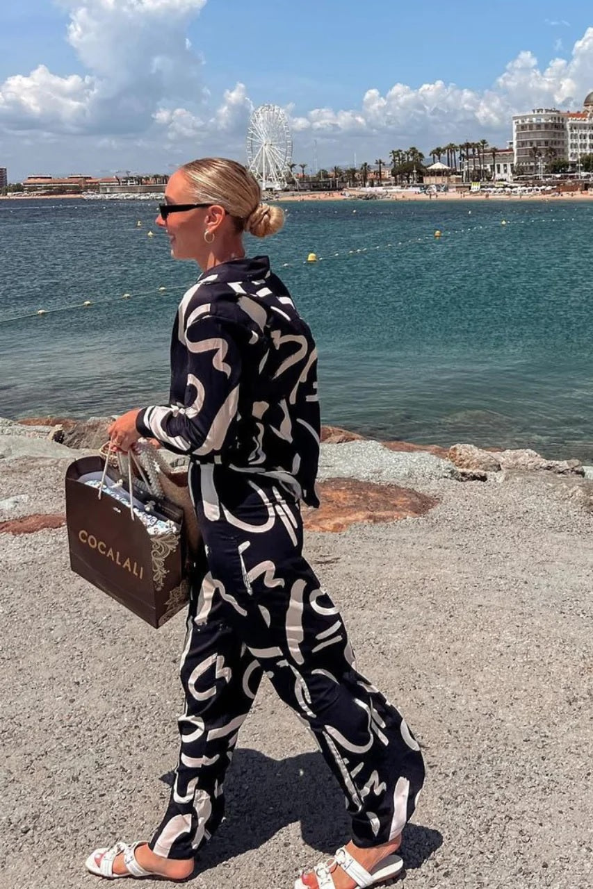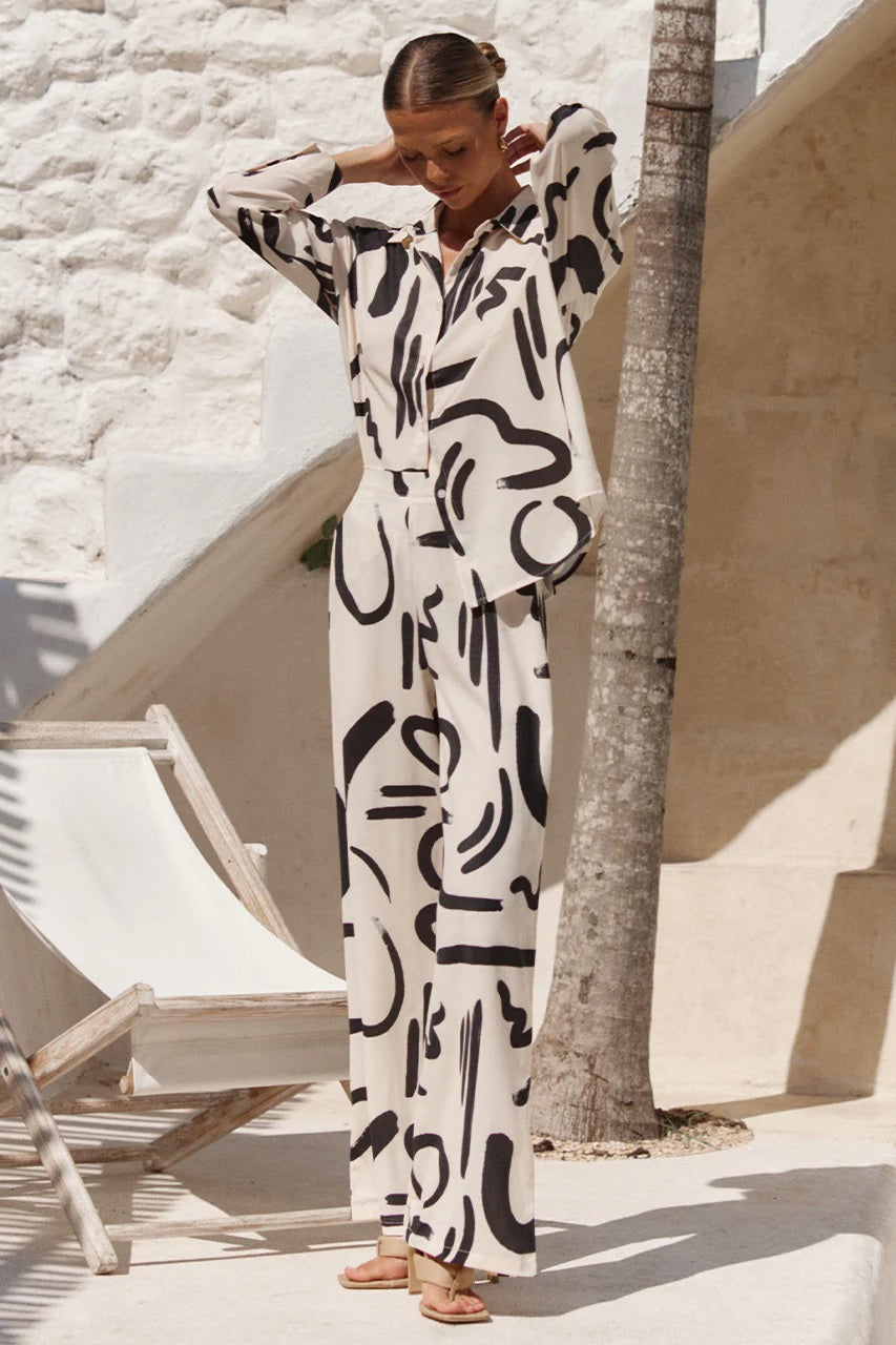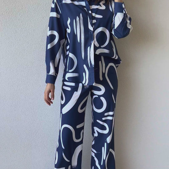 Step into effortless sophistication with this abstract brushstroke print co-ord set, designed for both comfort and bold style. Crafted from lightweight, breathable fabric, the set features a relaxed-fit button-down shirt with full sleeves and a flattering collar neckline, paired with wide-leg trousers that offer an elongated silhouette. The modern, artistic print adds a striking edge, while the soft fabric ensures ease of movement for day-to-night versatility. Perfect for vacations, brunches, or evening outings, this set combines effortless chic with contemporary elegance.