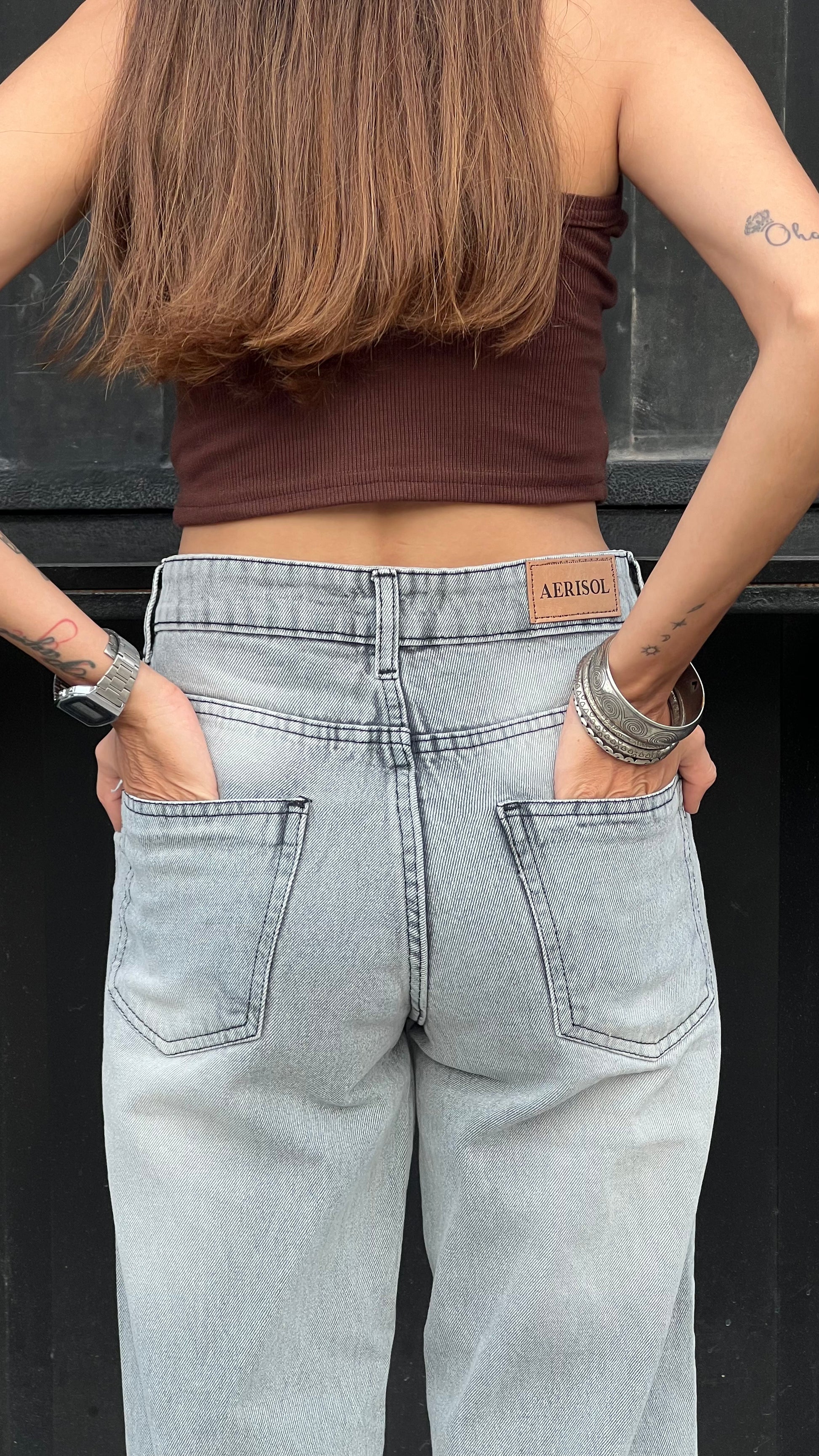 The soft grey wash lends a versatile, contemporary edge—ideal for pairing with everything from sleek crop tops to oversized knits. A flattering high-rise waist elongates the figure, while the baggy cut brings movement and attitude to every step.