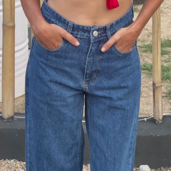 Crafted in pure cotton denim, these stone blue high-waist baggy jeans embody effortless ease with a refined edge. The wide-leg silhouette offers a fluid, relaxed drape while maintaining structure, creating a look that is both laid-back and elevated.