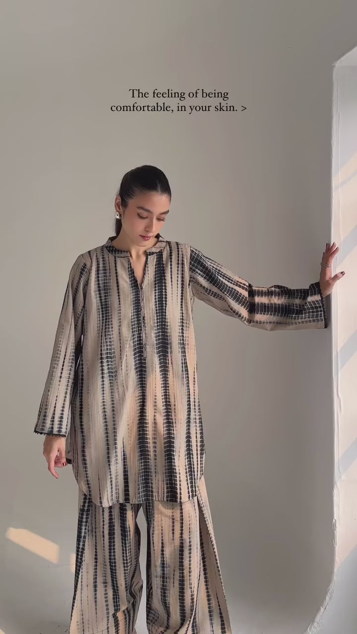 Neutral beige base with bold black vertical tie-dye stripes, perfect for chic everyday styling.