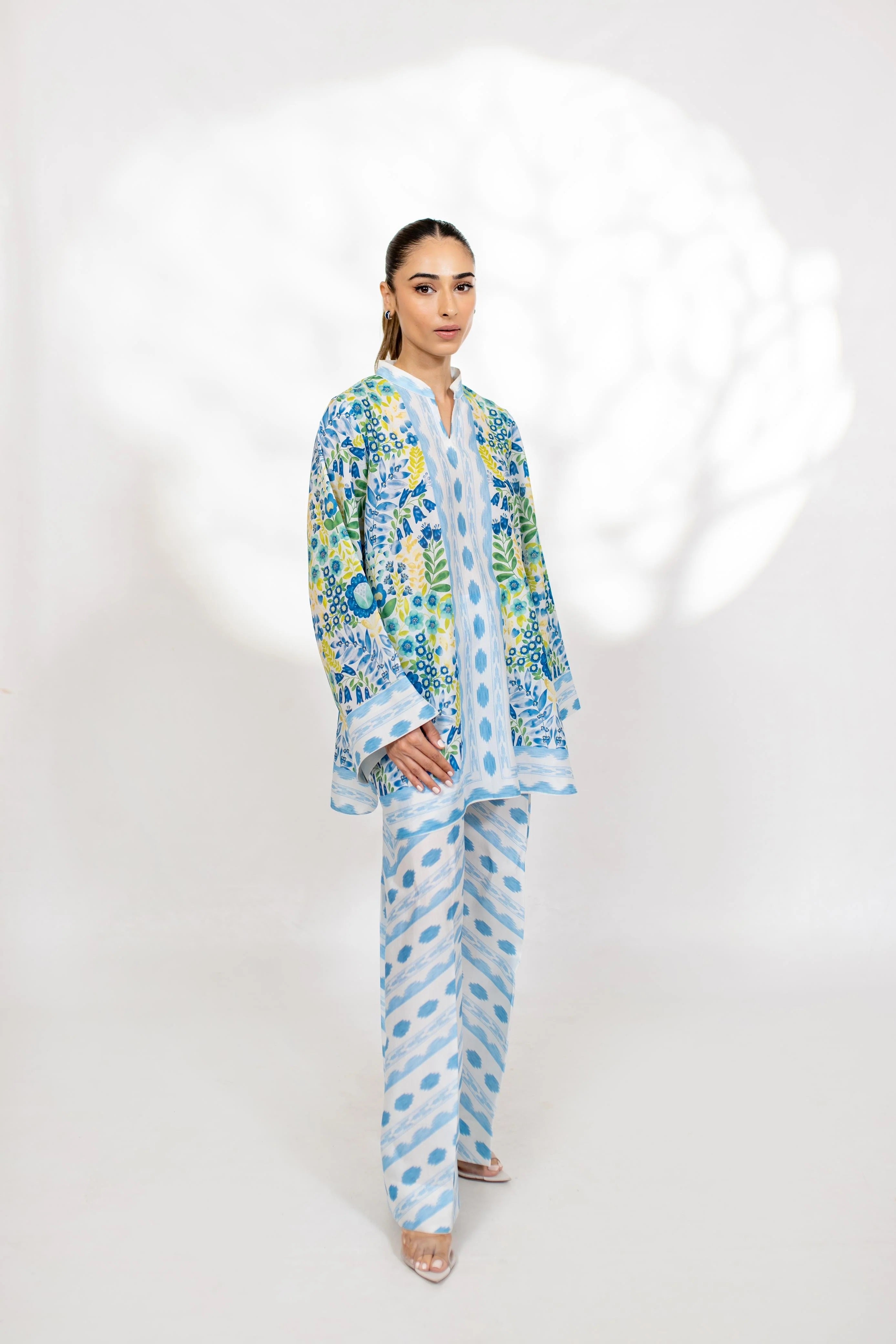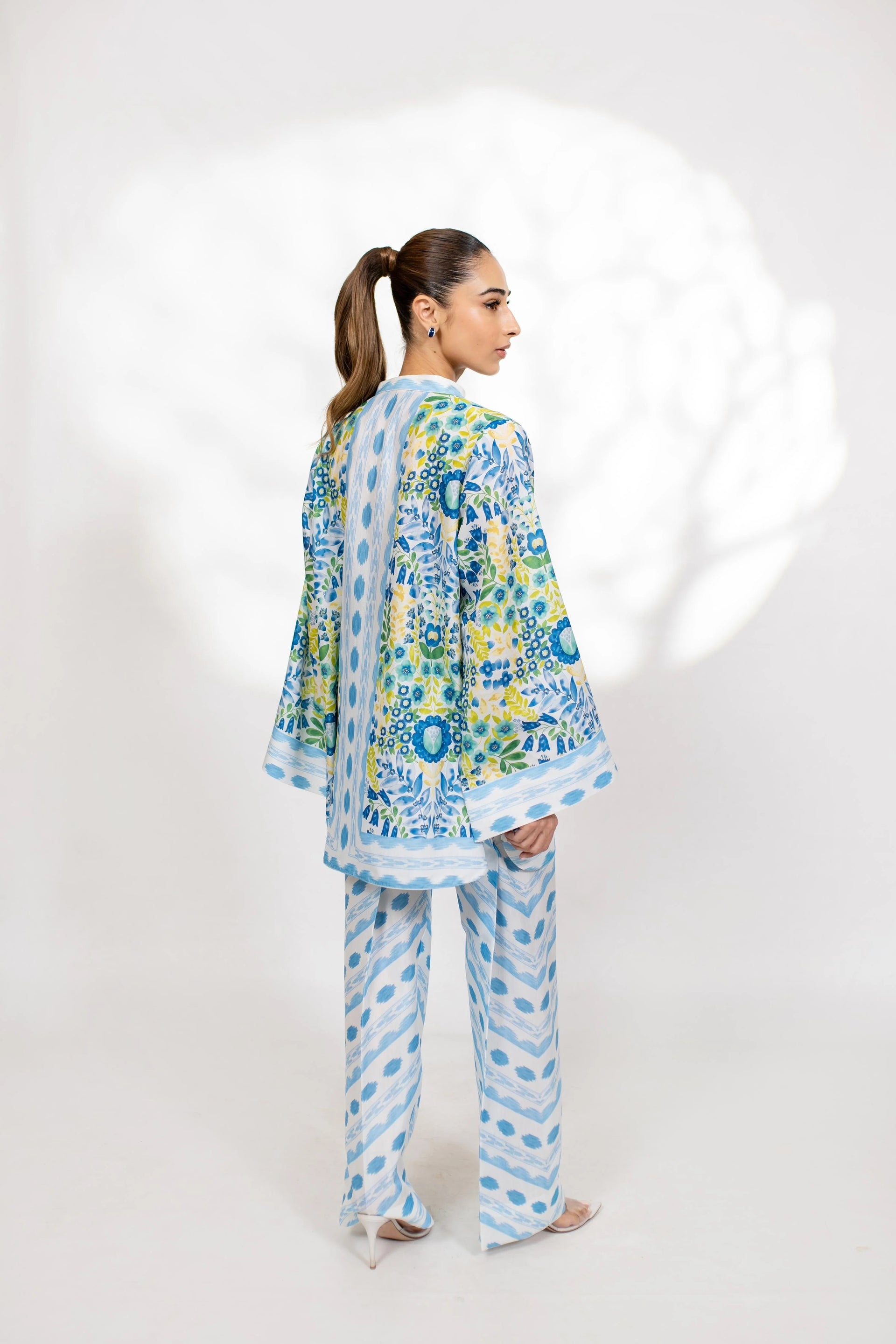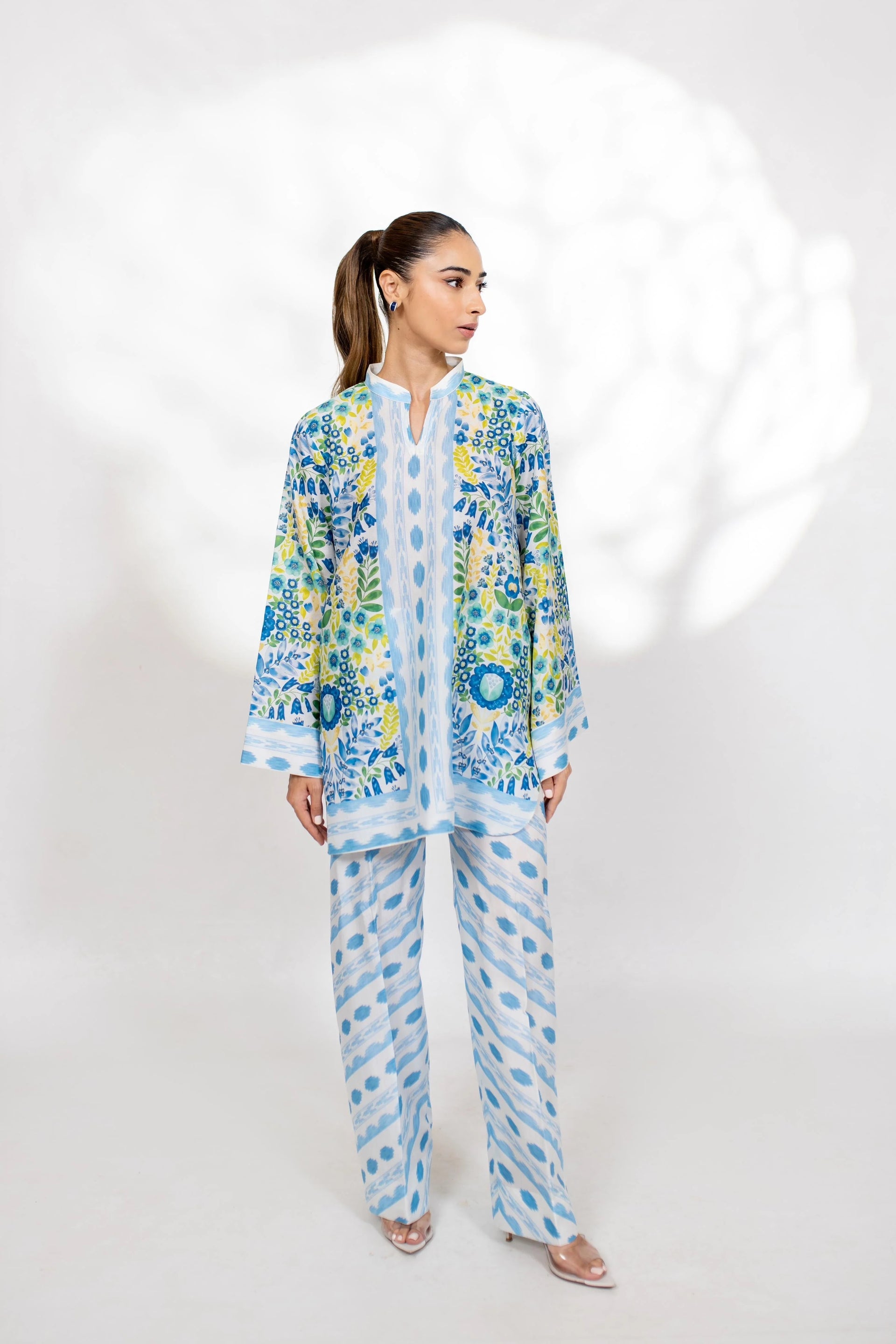 A refreshing blue-toned co-ord set with floral and geometric fusion prints. The light and breezy fabric makes it perfect for summer wear while maintaining chic elegance.